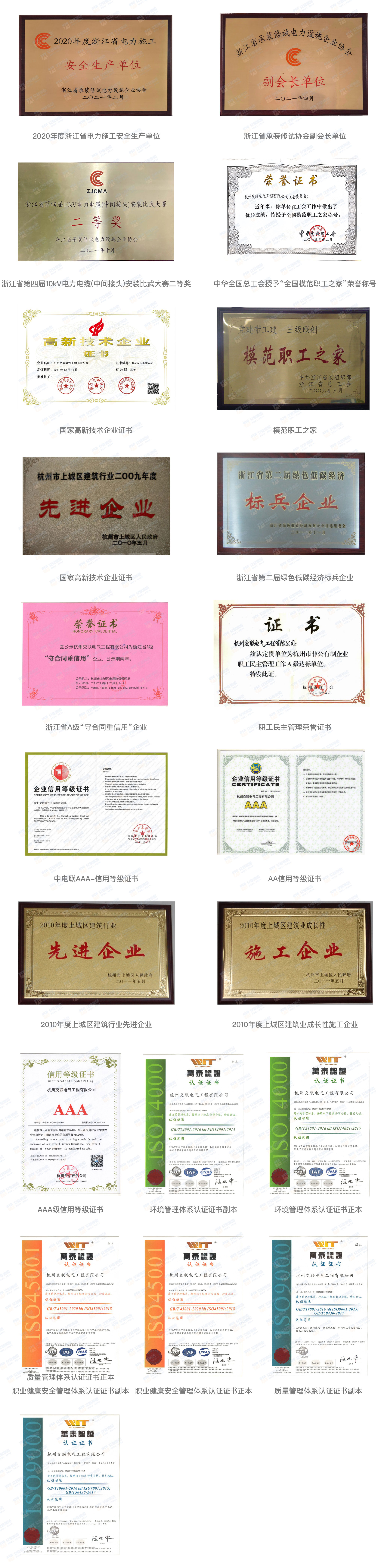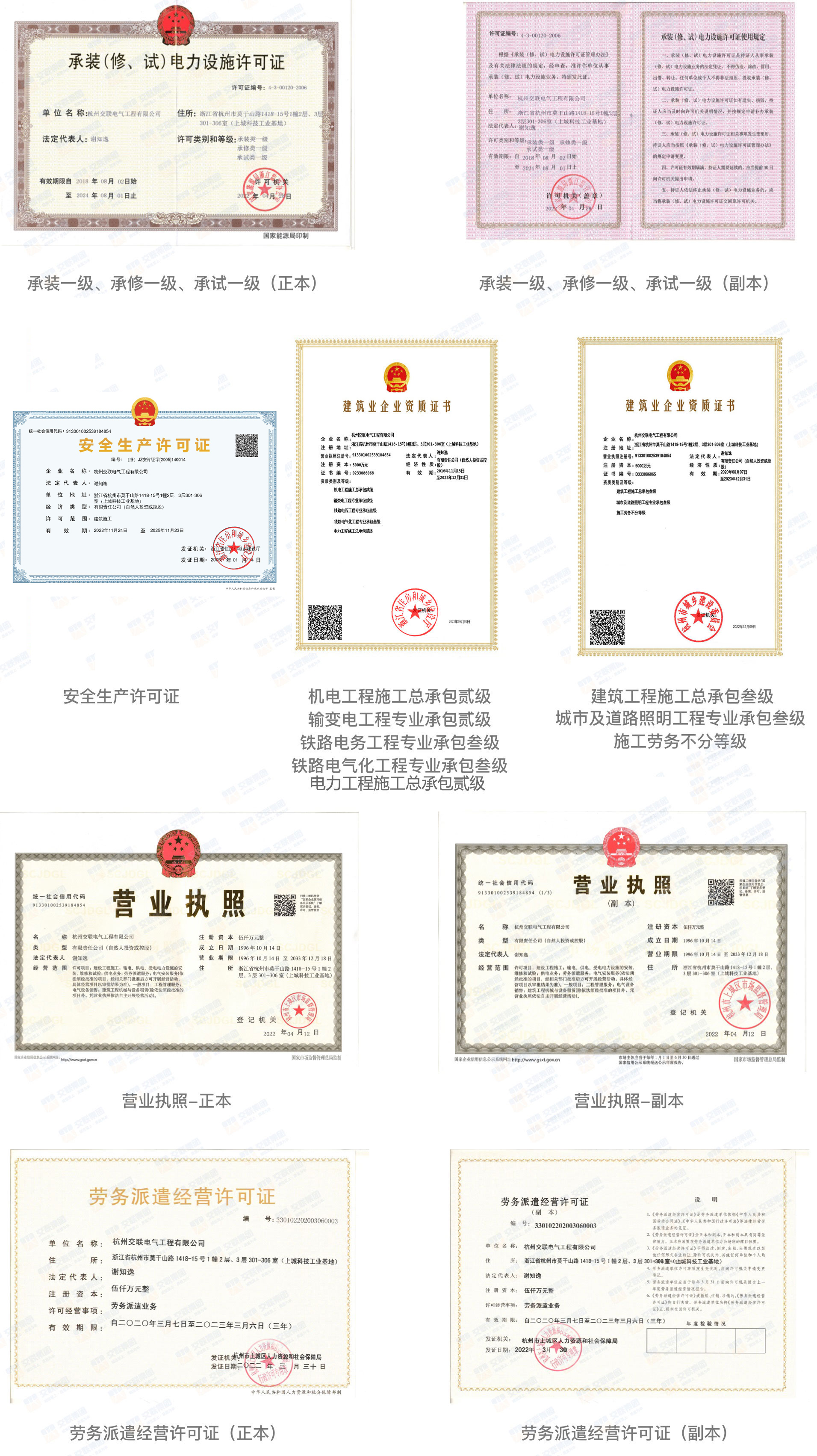 杭州交联电气工程有限公司是高度专业化的电力开发和现代服务企业。公司拥有国家能源局颁发的电力设施承装一级、承修一级、承试一级许可证。同时,还拥有城乡建设部颁发的机电工程施工总承包贰级、输变电工程专业承包贰级、电力工程施工总承包贰级等资质。